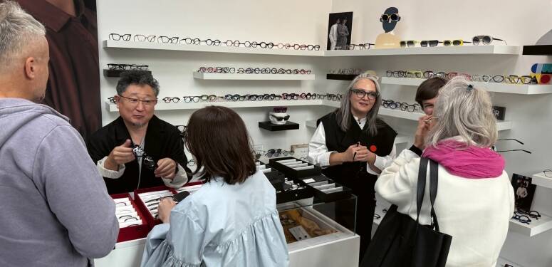 Weronika Rokicka: Od tego czasu to marzenie kiełkowało. W 2019 roku pojechałam pierwszy raz na targi optyczne do Paryża, na których Pan Yoshinori został już siódmy raz nominowany do najważniejszej nagrody Best Designer, a dwa razy wygrał w tej kategorii. Jest to nagroda niczym Oscar w świecie optycznej sztuki. W tym roku został ponownie nominowany ze swoją pracą z autorskiej kolekcji Yoshinori Aoyama. Wcześniej były to projekty Factory 900. W międzyczasie znów byliśmy w Japonii, odwiedzić ich zakład rzemieślniczy. Widzieliśmy, jak wyglądają maszyny, jak to wszystko powstaje, poznaliśmy cały zespół. Ojciec Pana Yoshinoriego, który ma 87 lat, wciąż z nimi pracuje w tym zakładzie, co jest niesamowite. Powtarzaliśmy im już od kilku lat, że jeśli nadarzy się okazja, aby przed lub po wyjeździe do Paryża, odwiedzili nas w Polsce, to będzie to dla nas ogromny zaszczyt. W tym roku w końcu udało się to zorganizować.