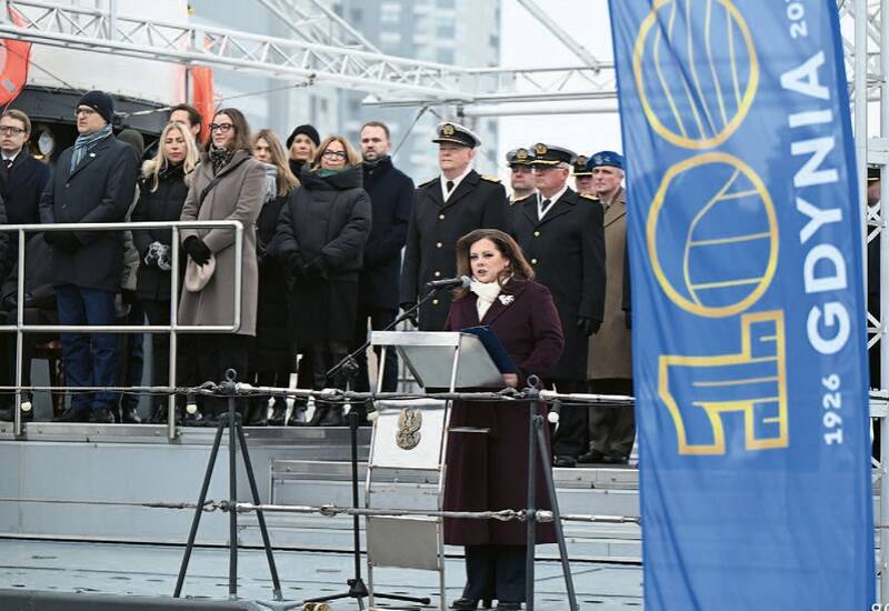 Prezydent Gdyni Aleksandra Kosiorek przemawiająca podczas oficjalnych uroczystościach z okazji 100. rocznicy nadania Gdyni praw miejskich