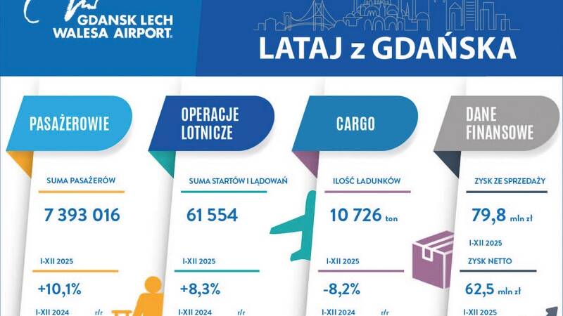 W minionym roku z gdańskiego lotniska skorzystało prawie 7,4 mln pasażerów, co oznacza wzrost o ponad 10 proc. w porównaniu z rokiem 2024. Dokładnie w 2025 roku Port Lotniczy Gdańsk obsłużył 7 393 016 pasażerów. W tym samym czasie wykonano 61 554 operacji lotniczych, czyli startów i lądowań, co stanowi wzrost o 8,3 proc. rok do roku.