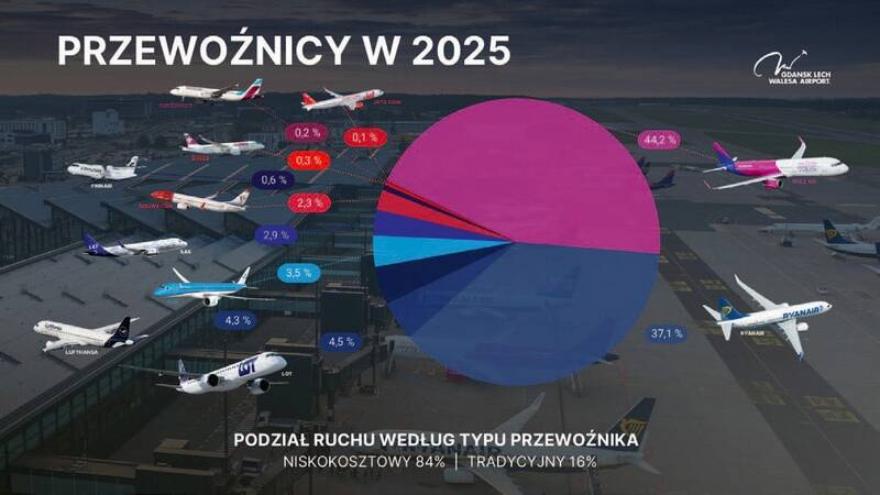 Wśród kierunków, które wybierali nasi pasażerowie w ubiegłym roku, w czołówce były ponownie: Londyn (538 270 pasażerów), Oslo (486 957) i Kopenhaga (428 582). Największy udział w ruchu regularnym w 2025 roku miała linia lotnicza Wizz Air. Obsłużyła w Gdańsku 44,2% pasażerów, następny był Ryanair (37,1%). Na kolejnych miejscach były Polskie Linie Lotnicze LOT (4,5%) i Lufthansa (4,3%).