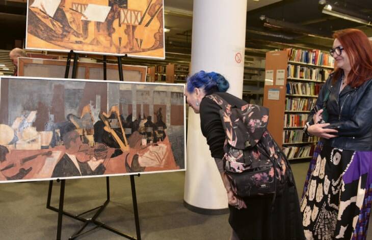 Wystawę obrazów Kazimierza Śramkiewicza wspierał prof. Andrzej Śramkiewicz, syn Kazimierza, również artysta związany z gdańska ASP. To on wydobył niektóre prace ojca z zapomnienia. Ponownie przywrócił im pamięć i galeryjną obecność. Kazimierz Śramkiewicz zmarł 1998 roku i choć po jego śmierci było kilka wystaw retrospektywnych, to dzisiaj czas biegnie szybko i aktualnie bardziej liczy się to co tu i teraz niż dorobek i tradycja. I nawet prace najwybitniejszych artystów pochowane w zakamarkach piwnic albo muzealnych magazynów, tak jak prace Kazimierza Śramkiewicza, przestają istnieć w społecznej świadomości i odbiorze. Stąd inicjatywa, by przywracać pamięć mistrzów, jest bardzo cenna. Zatem okazałą przestrzeń pierwszego piętra Biblioteki Głównej UG z regałami wypełnionymi książkami, zajęły na specjalnych, dwustronnych metalowych stelażach (pomysł i wykonanie Galeria Glaza) obrazy z różnych okresów twórczości Kazimierza Śramkiewicza. Dominowały, charakterystyczne w twórczości artysty, prace przedstawiające w różnych konfiguracjach instrumenty muzyczne. Nie ukrywam, że to mój ulubiony temat w twórczości Kazimierza Śramkiewicza. Przesycone odcieniami brązu, rozjaśniane żółtymi, mieniącymi światłem kontrapunktami, czasami nieco stłumione, schowane w półcieniach pomarańczowych refleksów piękne linie drewnianych instrumentów – dostojne, jakby czekające na muzyka. Były też (chyba tylko) dwie prace ze słynnymi stoczniowo-portowymi motywami pojawiającymi się w malarstwie artysty. Doskonale pamiętam plenery twórcze w Porcie Północnym w Gdańsku i artystów plastyków różnych generacji szukających w industrialnej przestrzeni tematów swoich prac. Śramkiewicz malował, co często podkreślano, dynamizm i zmienność portu i stoczni. Fascynowały go metalowe bryły. Ciekawe na wystawie były też – dość oszczędne, ale dostojne i zaskakujące – przynajmniej dla mnie – pejzaże artysty rodem z hiszpańskich i włoskich klimatów. We wszystkich pracach zwracała uwagę precyzja pędzla artysty, realistyczna, z nutą tajemniczego niepokoju, charakterystyka prezentowanych tematów, wykorzystywanie ciekawych pomysłów w tworzeniu perspektywy i kolorystyka, która zatrzymuje wzrok oglądających.